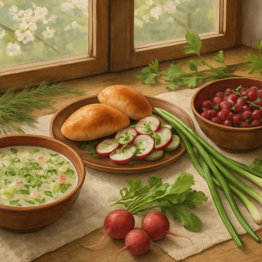 Весна — время обновления, и в русской кухне этому времени года соответствуют особые весенние блюда. Русская кухня весна богата легкими, свежими и полезными сезонными рецептами весна, которые помогают восстановить силы после долгой зимы. Традиционные весенние блюда отличаются использованием первых свежих овощей, зелени и молоденьких трав, что делает их не только вкусными, но и очень полезными.